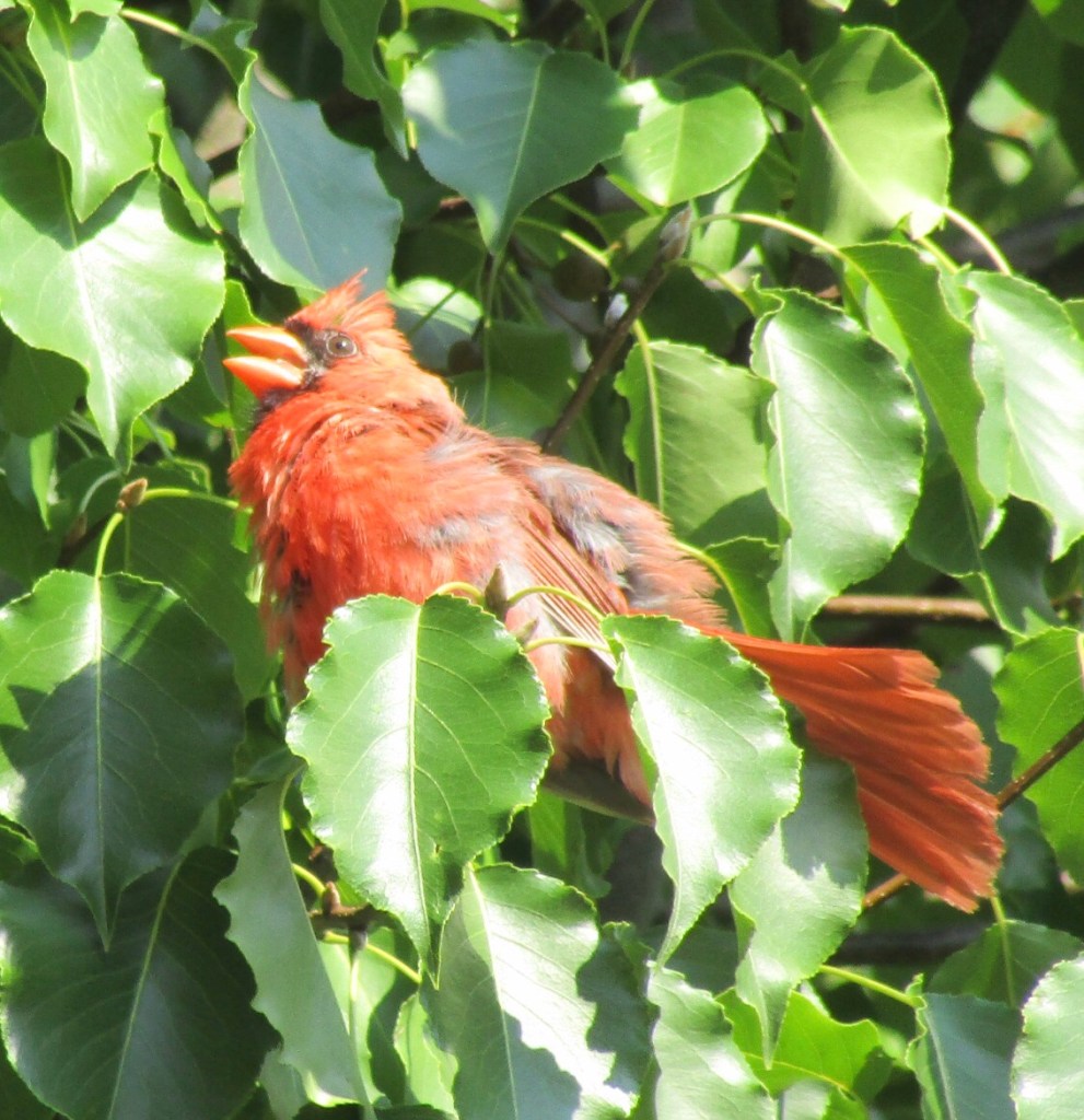 I do not recall ever before seeing a cardinal sitting still, high up in a tree, gazing around as if he were some emperor gazing down upon his kingdom. Yet, one day last week as I was going out in our backyard to water the flowers, I happened to gaze up into our pear tree, and much to my surprise, see this proud and beautiful cardinal sitting there. On impulse, I ran back inside and grabbed my camera, hoping that he would stay put—and he did. Now, it was a blustery day; so the leaves and the branches of his tree were in constant motion, as he continued to sit there, as still as he could be, just daring me to get a picture. Since he was way up high, I had to extend my camera’s zoom lens almost to its limit. This exaggerated every bit of movement; and trying to hold my camera steady and focusing on him—well, it seemed almost impossible. But, in spite of needing to hurry before he flew away, and in spite of trying to get anything more than a blur of red amidst the billowing leaves; somehow, God who provided the opportunity, facilitated the photos and a few managed to capture both his attitude and his beauty. As I reflect on this cardinal in a tree; on his view of me and mine of him—I realize that while we each seem odd to the other, we do have in common this privilege in our shared small space in the vast universe—we are created by Him who for His own purpose and for His glory, does all things well. We share a common purpose. We can, indeed, bring glory to the Maker who fashioned us both to reveal some unique, tiny bit of His remarkable nature.